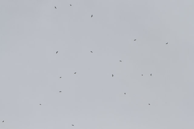 The birders also spend time talking with visitors about their work. A silhouette chart helps novices identify the various species as they pass overhead. Often little more than black dots, the birds standout especially well on days with high clouds. The white clouds offer contrast that make the birds more visible. While the birds often pass singularly or in small numbers, occasionally observers will see flocks of over 100 in what are known as “kettles” as the birds circle in updrafts to save energy for the flight to South or Central America